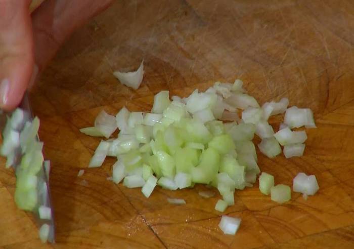 Сельдерей мелко порезать, добавить в кастрюлю и обжаривать, пока лук не станет слегка прозрачным.