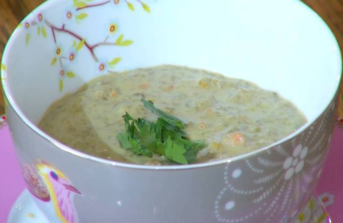 Готовый суп украсить листьями кинзы.
