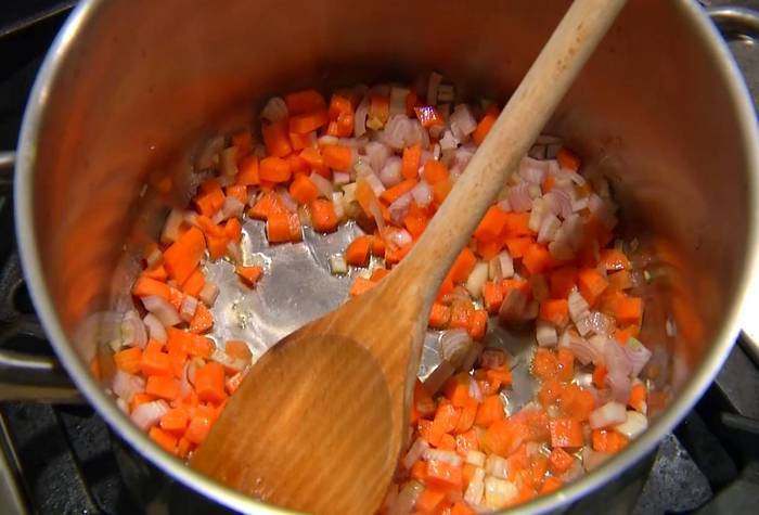Разогреть в большой кастрюле оливковое масло и немного обжарить подготовленные овощи.