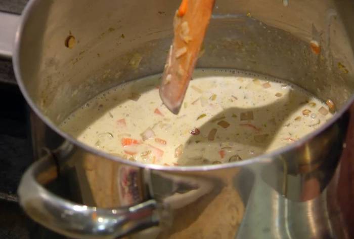 Добавить чечевицу, пасту карри, все перемешать, влить кокосовое молоко и варить суп около 20 минут до готовности.
