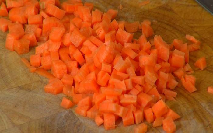 Морковь почистить и нарезать маленькими кубиками.