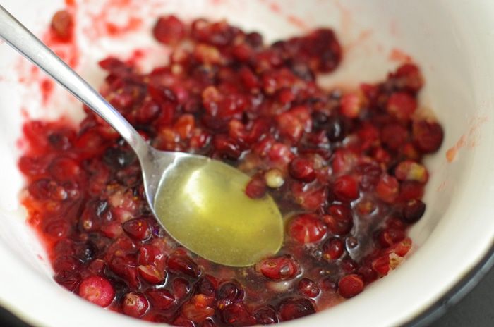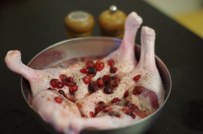 Утиные ножки посолить, поперчить по вкусу и добавить клюквенно-медовый соус, дать настояться 30 минут.