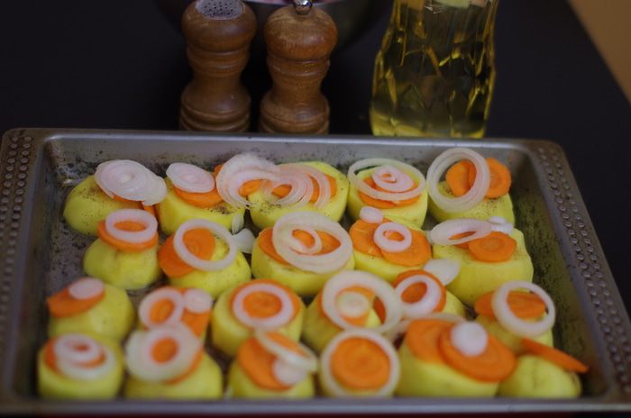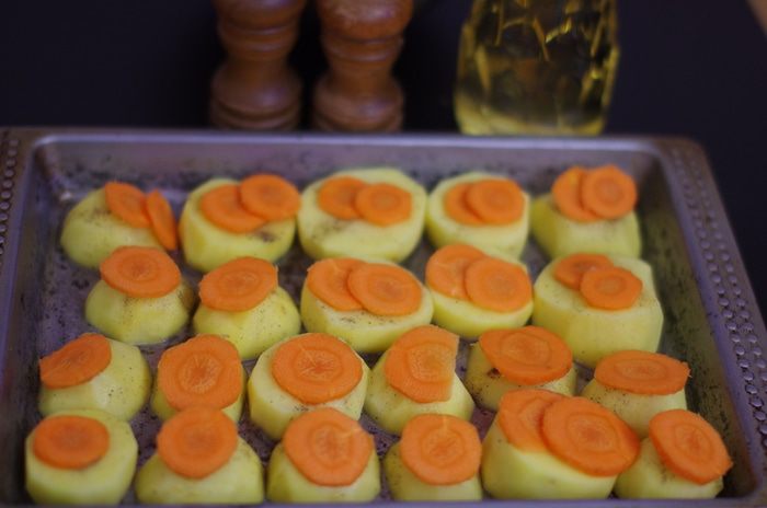 Подготовить морковь: почистить, нарезать тонкими ломтиками, положить красиво на картошку.