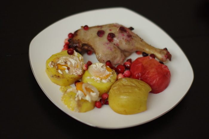 Очень вкусные получаются утиные ножки, пропитанные яблочками, медом и клюквой! А какая сладенькая и сочная картошечка... ммм... Настоящее осеннее чудо, согреет дождливым осенним вечером! К такому блюду отлично подойдет глинтвейн и теплая компания...