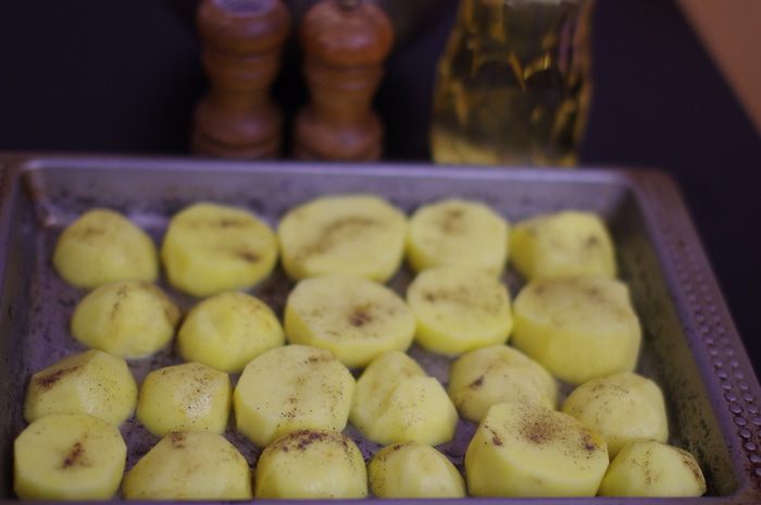 Пока утиные ножки маринуются, подготовить картофель: почистить, нарезать дольками 1 — 1,5 см, сложить на смазанный подсолнечным маслом противень, посолить и поперчить по вкусу.