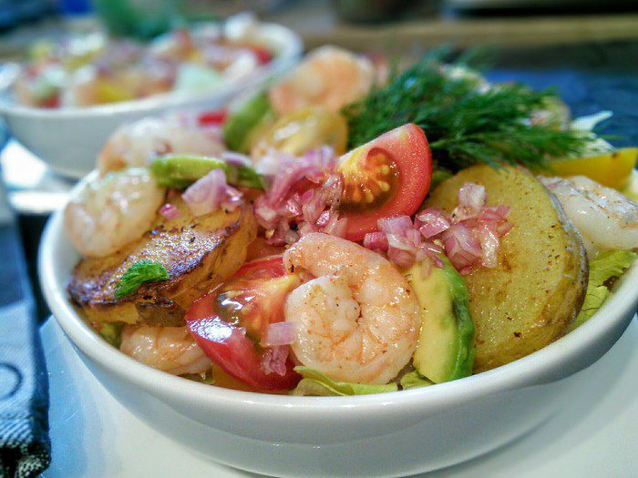 Еще одна вариация сытного, но легкого салата, как основного блюда. На этот раз овощной салат с креветками. Картофель в нем не был предусмотрен первоначально, но вписался в композицию как нельзя лучше:) Угощайтесь!