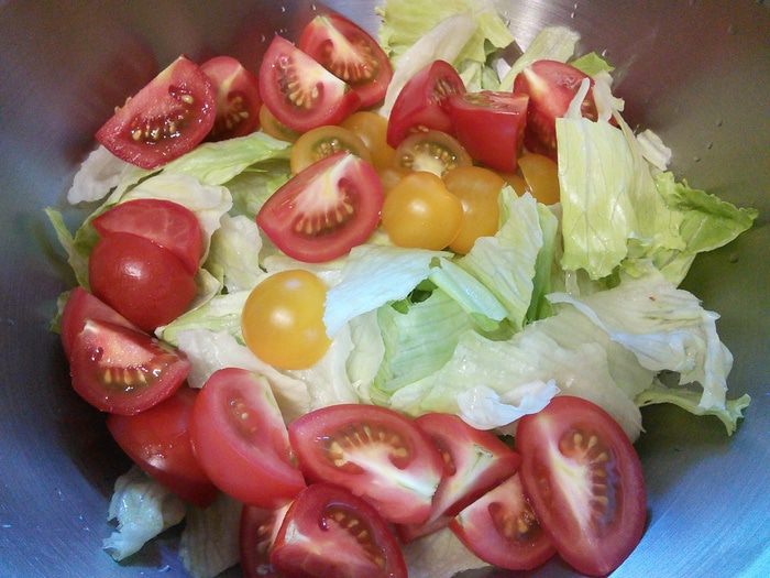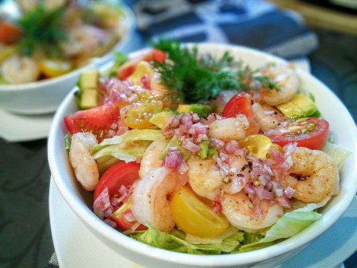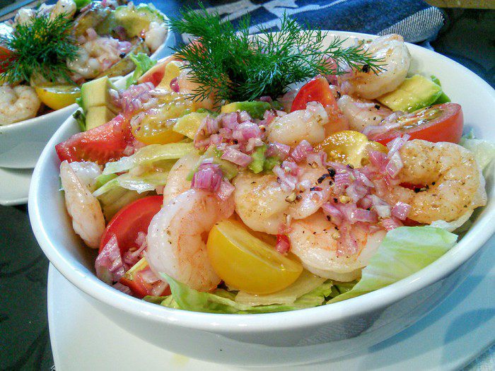 Креветки если замороженные — разморозить, если нужно, очистить. Авокадо должен быть спелым. Салат промыть и порвать на кусочки. Помидоры разрезать на половинки. Авокадо очистить, нарезать на ломтики и сбрызнуть лимонным соком.