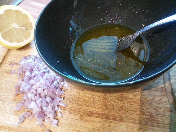 Шалот очистить и мелко нарезать. В мисочке соединить бальзамик (желательно светлый) с медом, солью, перцем и влить оливковое масло. Взбить вилкой до состояния эмульсии, в конце подмешать лук.