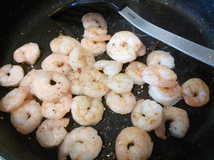 Креветки обжарить на разогретом масле 1 — 2 мин с обеих сторон, посолить и поперчить.