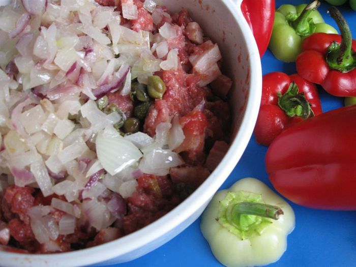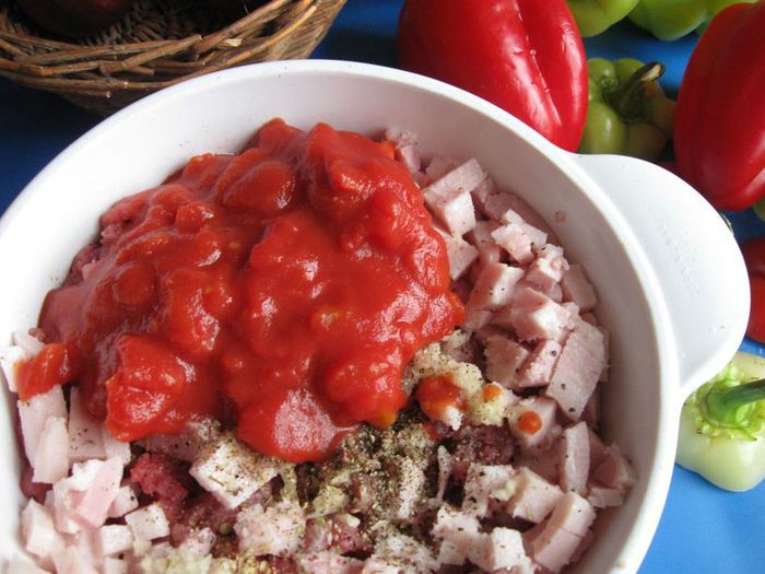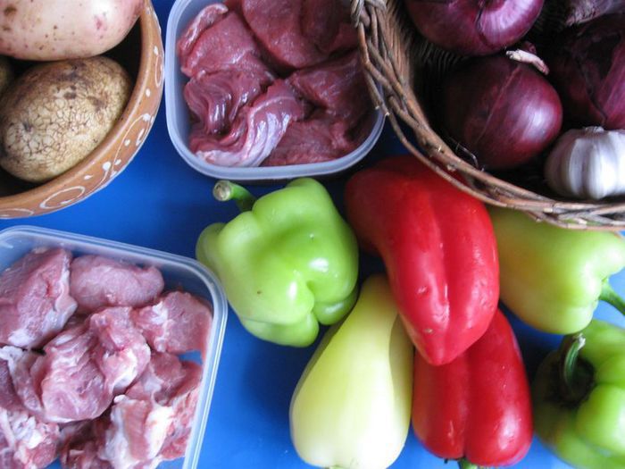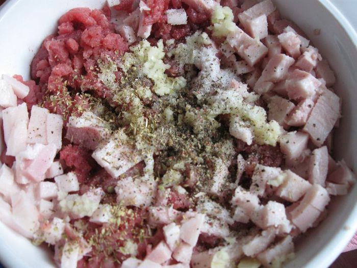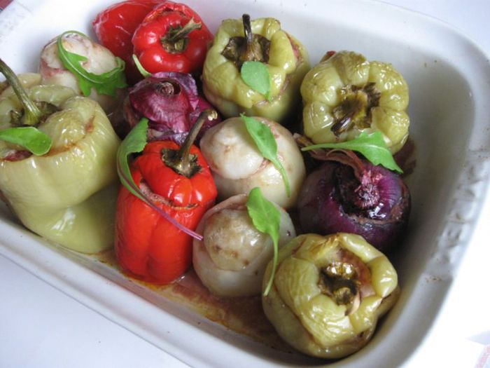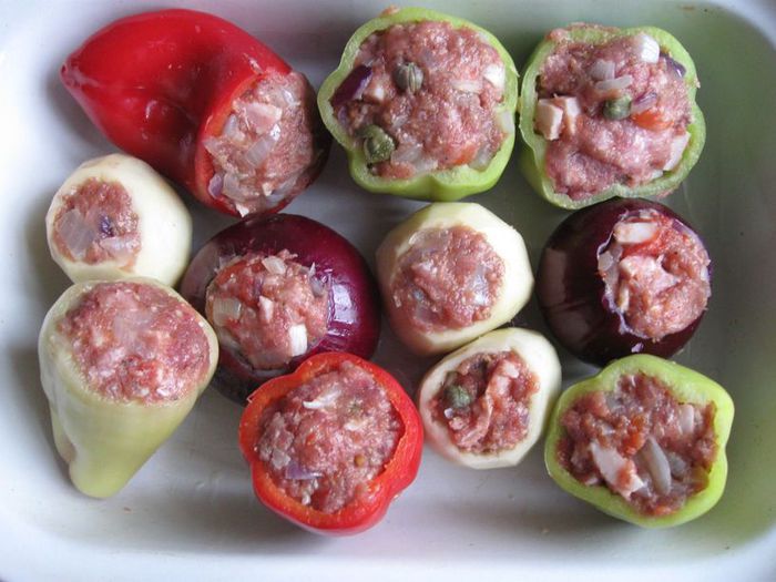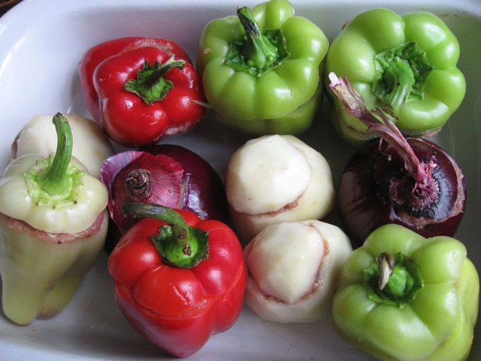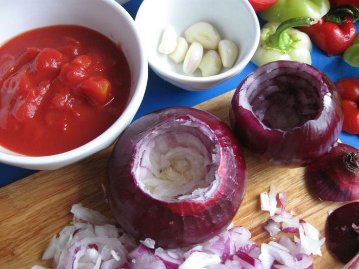 Удалить из лука серединную часть, стараясь не проколоть донышко, а также оставить тонкие стенки. Вынутую из лука часть вместе с еще 1 луковицей (я взяла репчатый лук) порезать, обжарить на масле виноградных косточек (2 столовых ложки). Чеснок почистить и измельчить. Картофель помыть, почистить, отрезать нижнюю часть, она не понадобится, срезать «крышечку», вынуть серединку острым ножом, стеночки и донышко у картофеля постараться сделать потоньше, чтобы он лучше пропекся.