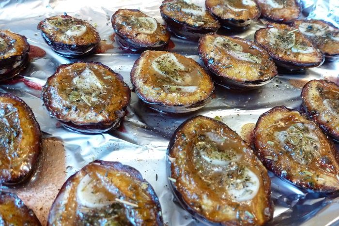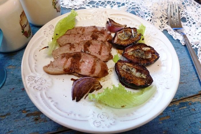 Вяленые сливы я готовила заранее. Разрезаем их на половинки, посыпаем прованскими травами, на каждую половинку кладем по кусочку чеснока, польем оливковым маслом и поставим в духовку при 90 — 110°С на 1,5 часа. Дверцу духовки необходимо приоткрыть и включить режим «конвекция». Хотите посуше сливы, держите дольше в духовке. Тут дело вкуса!