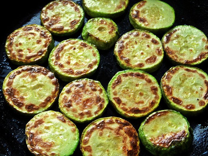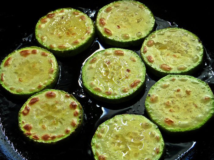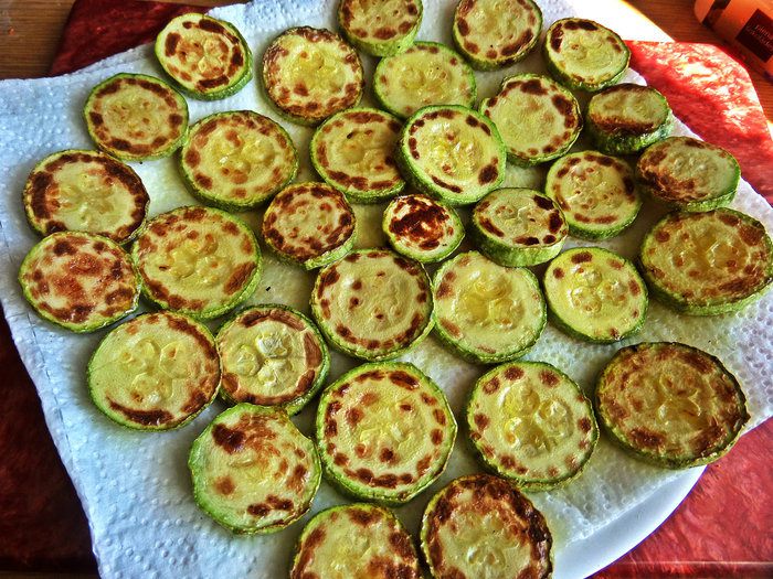 Перенести часть кабачков на общее блюдо, это будет первый слой.