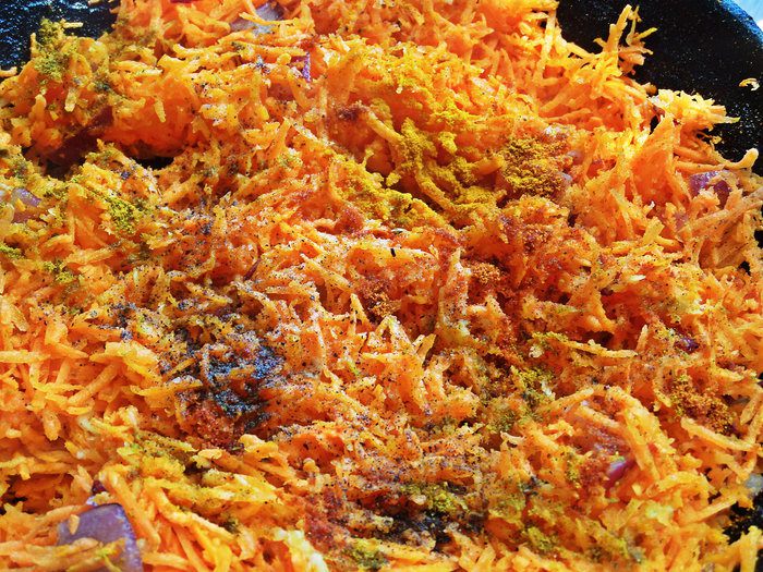 Обжариваем морковь с приправами после кабачков в растительном масле Biolio. Приправы можно менять, главное — соль, перец, чеснок должны присутствовать.