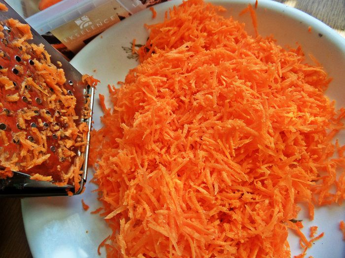 Натереть на терке. Можно на мелкой, но на крупной тоже хорошо проготовится.