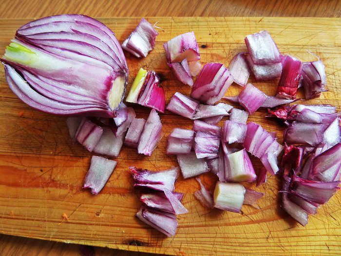 Нарезать лук. В прошлый раз был белый, но это особо не играет роли.