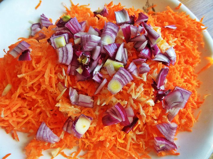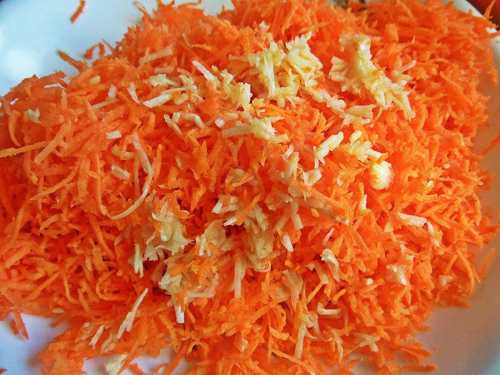 Измельчить зубчики любым способом в морковь. Я — на терке.