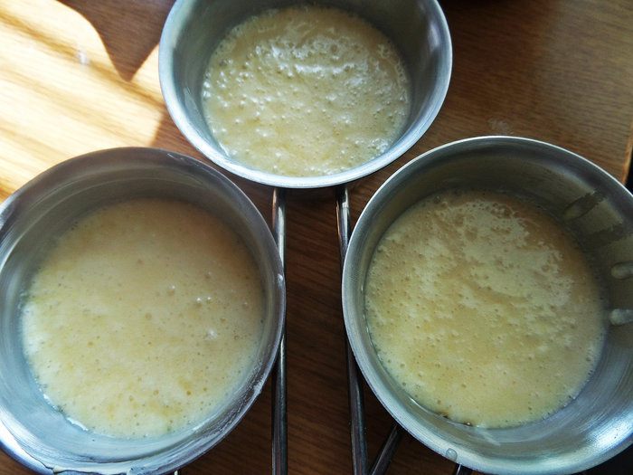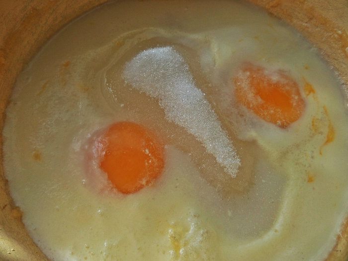 Соединить одно яйцо, 2 желтка, стакан молока и сахар с ванилью.