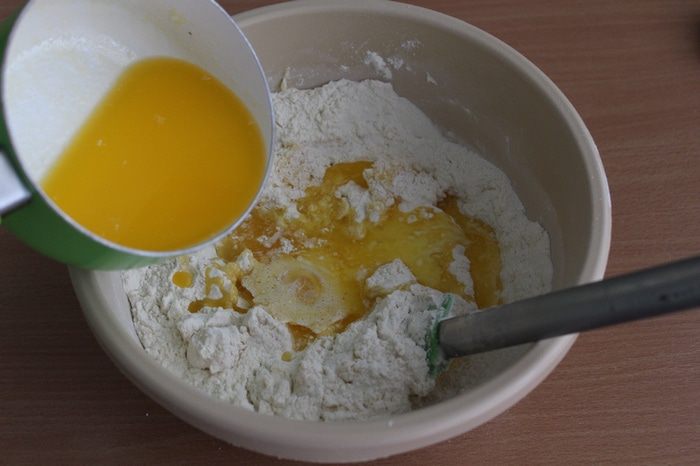 Молоко нагреть, добавить туда сливочное масло, помешать, чтобы масло растопилось. Остудить до теплого состояния, ввести в мучную смесь, перемешать.