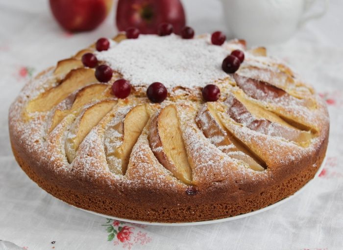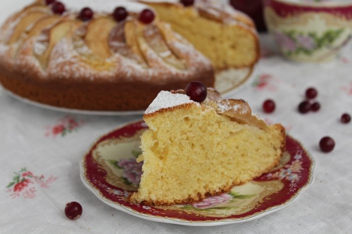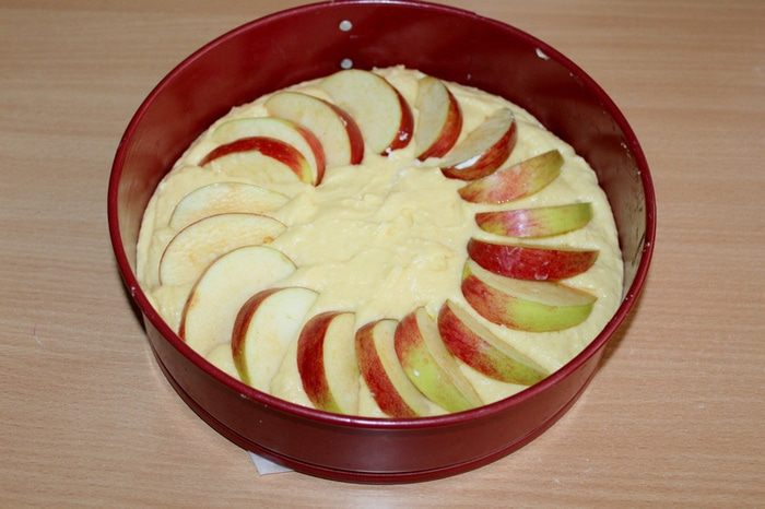 Выложить тесто в смазанную форму, по кругу выложить тонко нарезанные дольки яблок.