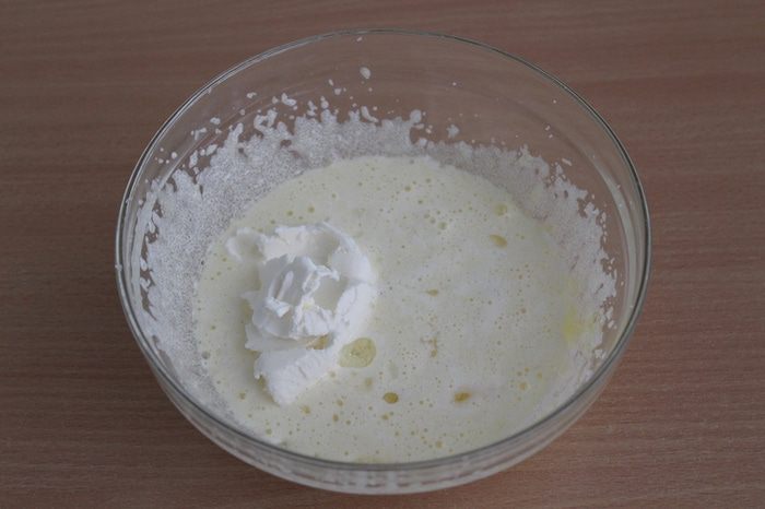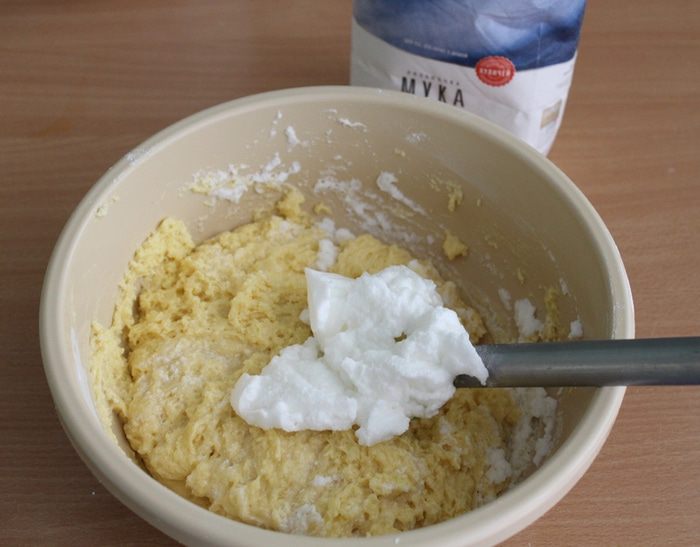 Белки взбить отдельно до устойчивых пиков и аккуратно добавить в тесто, перемешивая снизу вверх.