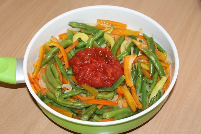 Вскипятить воду, подсолить воду и опустить нарезанную стручковую зеленую фасоль. Варить не больше 3 минут. Быстро откинуть фасоль на дуршлаг. Добавить к обжаренным овощам. Обжарить вместе 3 минуты.