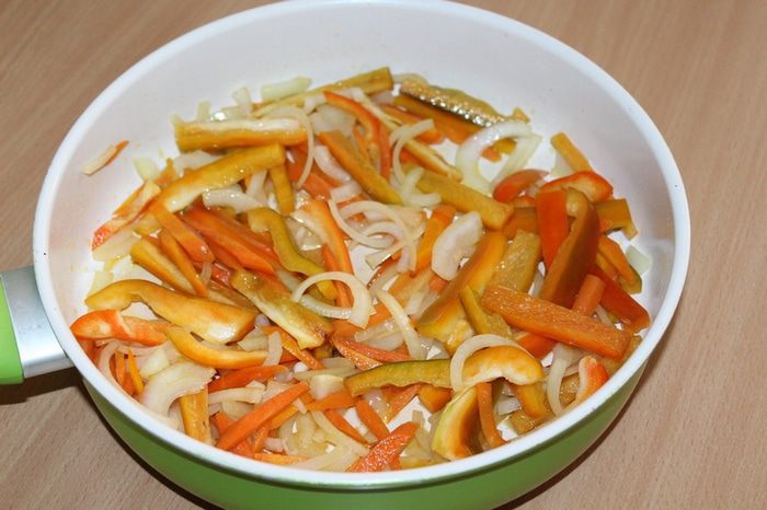 В сковороде хорошо прогреть масло, добавить нарезанный полукольцами лук, соломкой морковь и перец, жарить около 5 минут.