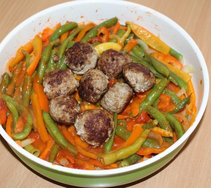 Соте из стручковой фасоли готовится очень быстро, и в результате получается сочным с чуть хрустящими ингредиентами. С добавление фрикаделек получаем полноценный ужин.