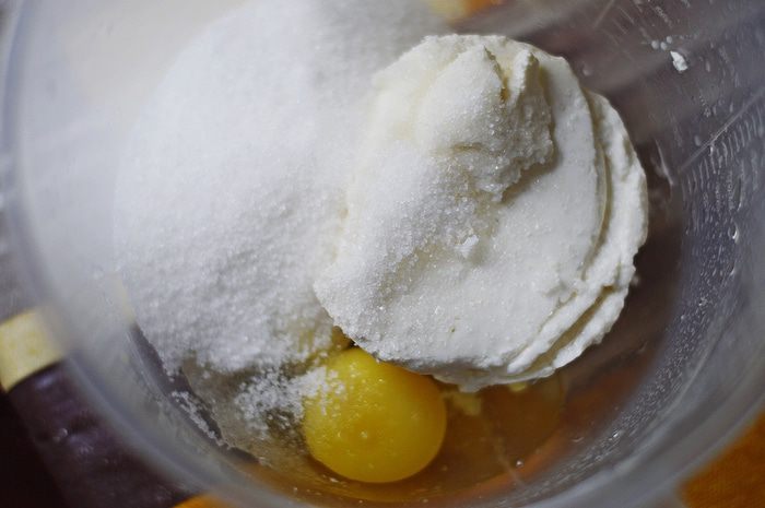 Готовим начинку. Для этого нужно смешать рикотту с яйцом, сахаром и ванильным сахаром.