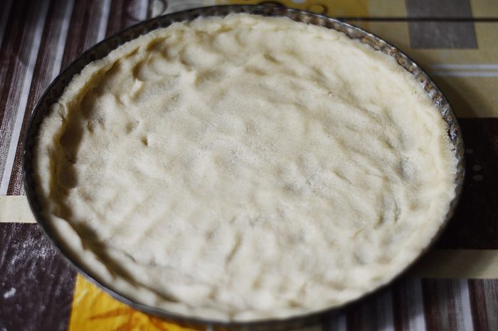Смазать форму для выпечки сливочным маслом и распределить тесто по форме, сформировав аккуратные бортики.