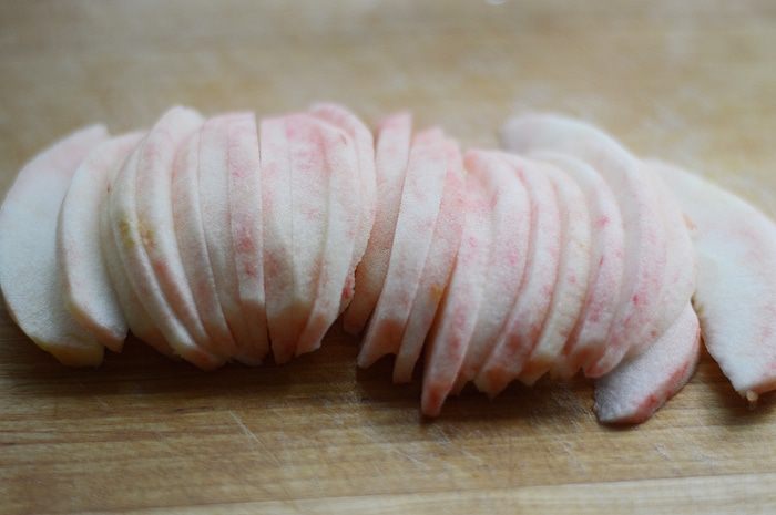 Яблоки очистить от кожуры и семечек и нарезать красивыми одинаковыми дольками. Если яблоки большие, то хватит и двух штук.