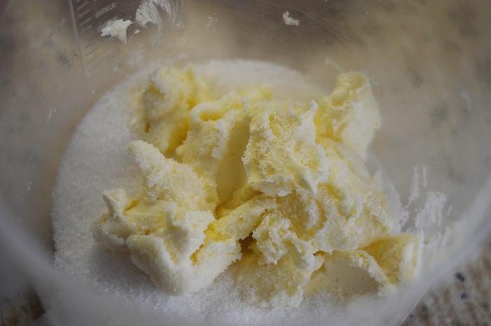 Готовим тесто. Для этого нужно сначала смешать сливочное масло со 100 г сахара. Можно вилкой, можно миксером. Масло должно быть мягкое, для этого оставьте его при комнатной температуре на 20 — 30 минут.