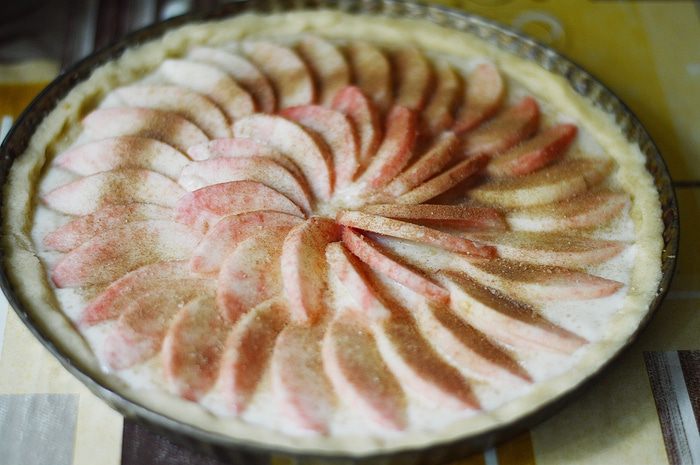 Уложить яблоки спиралью внахлест на творожную начинку. Сверху по вкусу можно присыпать яблоки корицей и сахаром.