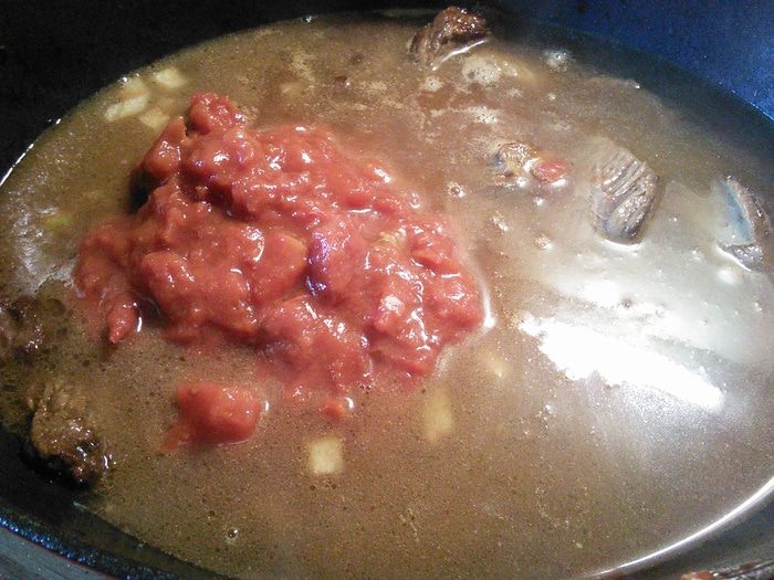 Добавить бульон или воду, томаты в собственном соку от «Помидорки», накрыть крышкой и тушить на маленьком огне 1,5 часа.