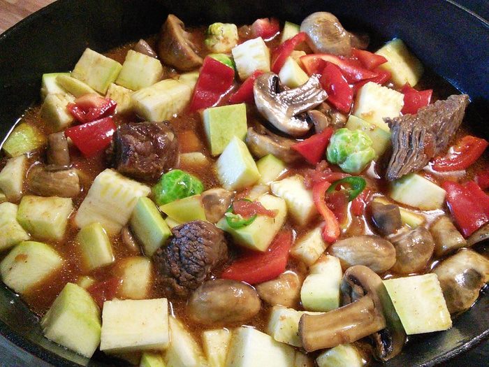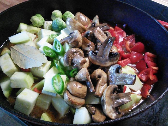 Мне под руку попалась горсть брюсельской капусты, ее я тоже заложила в айнтопф.