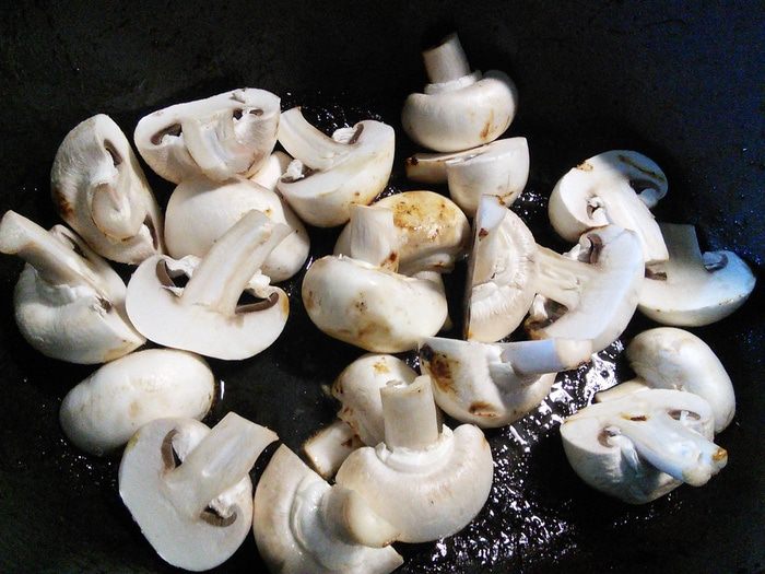 Помыть и обсушить шампиньоны, нарезать на половинки, мелкие грибы оставить целиком.