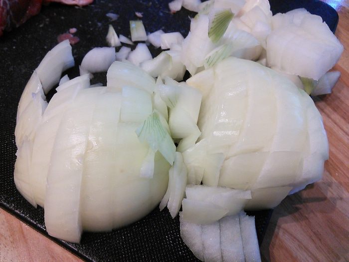 За время жарки мяса порубить крупным кубиком лук. Очистить чеснок.