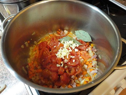 Затем добавляем чеснок, очищенные и нарезанные томаты «Помидорка» и розмарин (можно свежий). Обжариваем пару минуток.