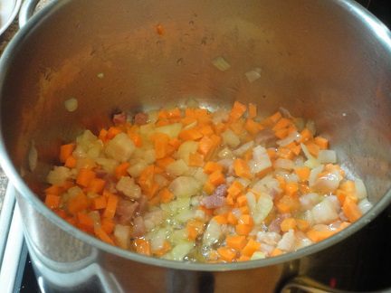 добавляем лук, доводим его до прозрачности, затем добавляем морковь. Пассеруем на медленном огне при закрытой крышке минут 8.