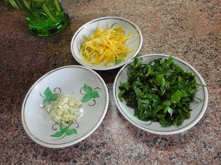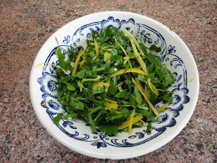 За это время приготовим гремолату — ароматную приправу, активно используемую итальянцами. Я использовала меньшие пропорции. Цедру снимаем тонкой стружкой и нарезаем ножом. Мелко рубим петрушку и чеснок.