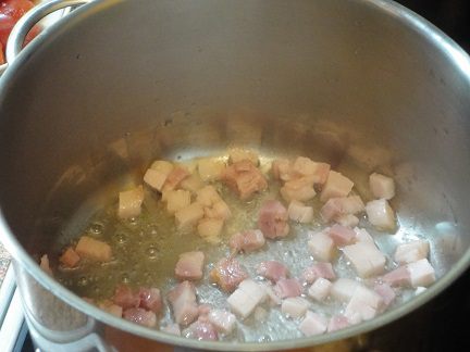 В кастрюле разогреваем оливковое масло и выкладываем грудинку, вытапливаем жир.