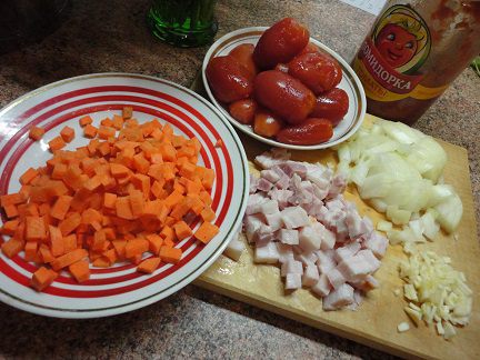 Овощи и свиную грудинку режем небольшими кубиками.