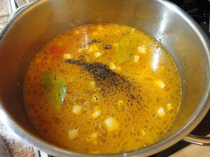 Доливаем горячий бульон и добавляем готовую перловку, лавровый лист, черный молотый перец и соль. Доводим до кипения и даем настояться.