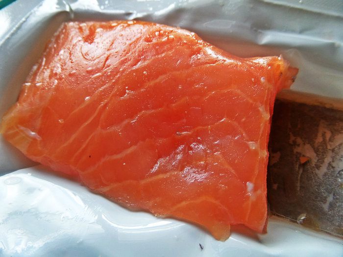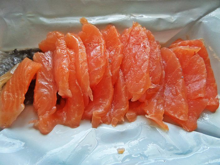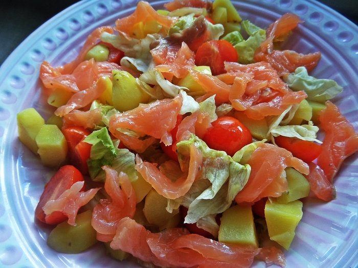 Перенести дольки в центр салата. Завершить розочкой из рыбы.