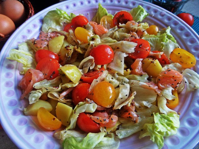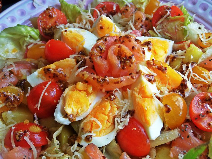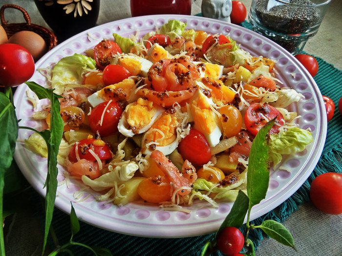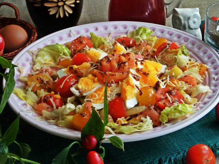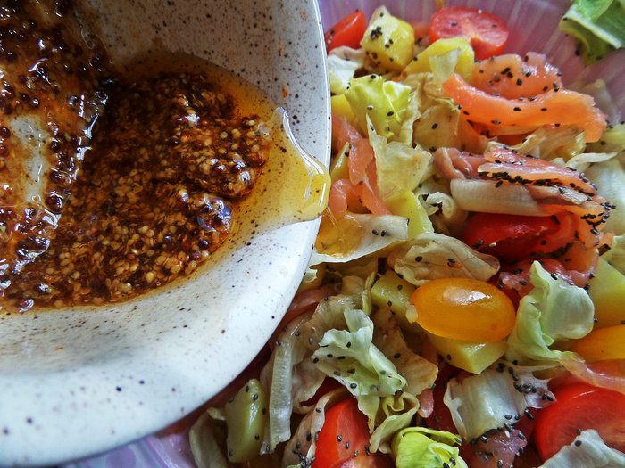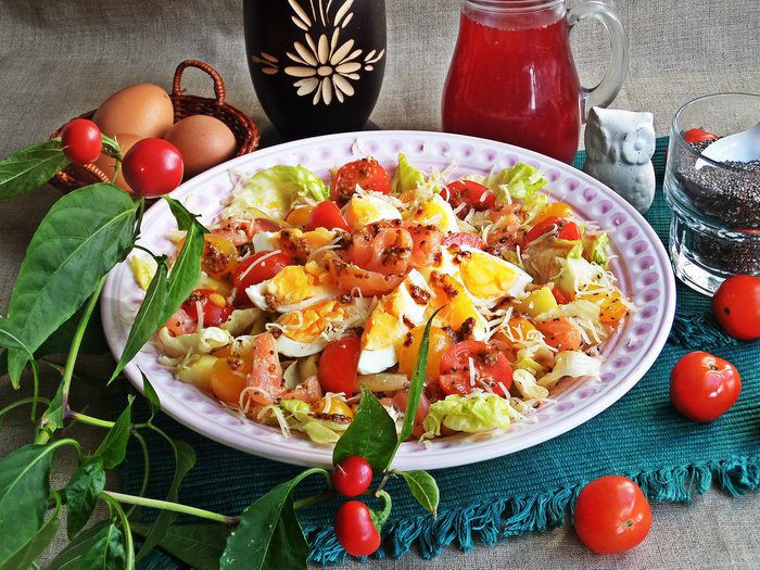 Такой салат смело заменит легкий ужин, ароматное масло дополнит вкус, горчица добавит пикантности, а семена чиа прочно входят в наши дома. И вот вам вариант использования их не только в утренних коктейлях.