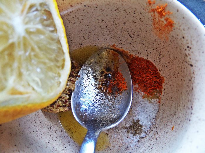Для заправки смешать масло Biolio, горчицу c зернышками, паприку, соль, перец и сок лимона.