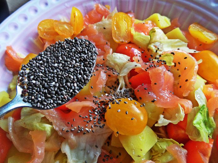 Такому салату лучше дать настояться минут 5 — 10, тогда чиа полностью размякнут, и все овощные соки объединяться.