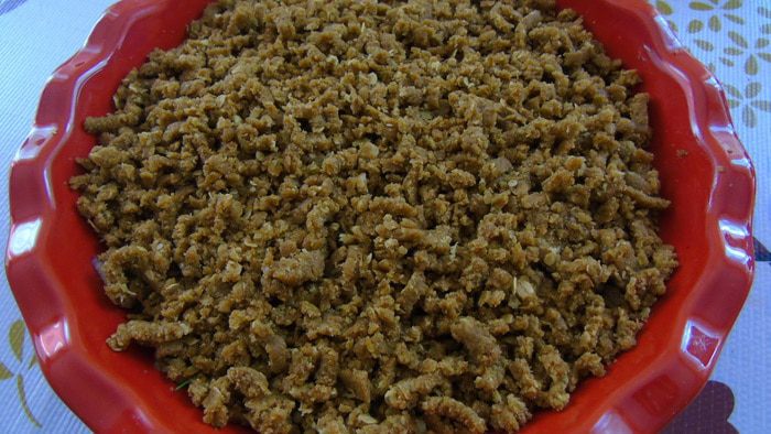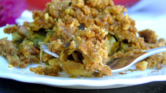 Приготовьте приправу для баклажанов: измельчите зелень (кинзу, укроп, сельдерей, петрушку), нарежьте лук и чеснок, влейте уксус, добавьте приправы (1 ч. л. сунели, 1/2 ч. л. красного перца, 1/2 ч. л. шафрана), а также кориандр, посолите и хорошо перемешайте.