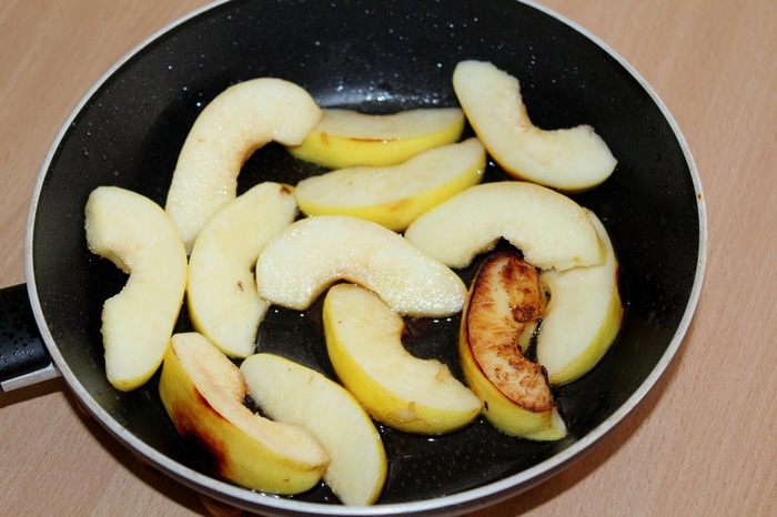 Айву нарезать дольками, обжарить на растительном масле с двух сторон.