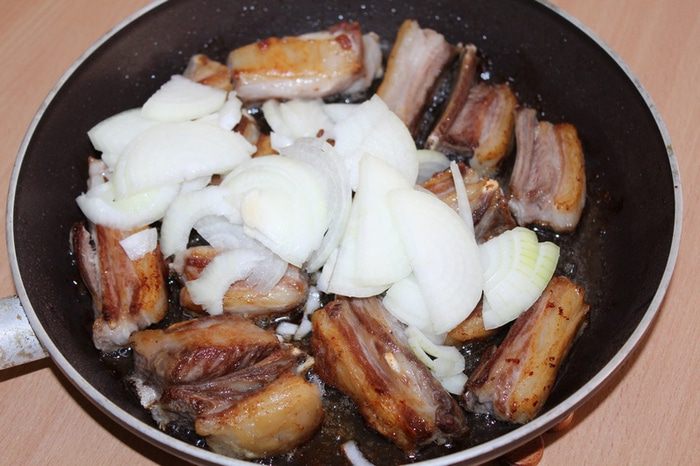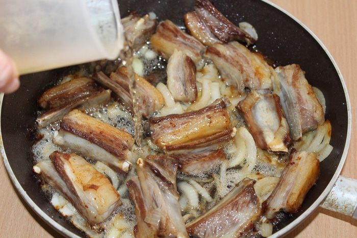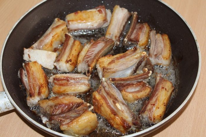 Ребрышки обжарить до золотистой корочки.