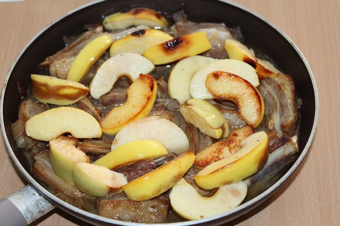 Выложить кусочки айвы, долить воды, чтобы мясо было покрыто, закрыть крышкой и томить около 45 — 50 минут, до мягкости баранины и айвы. В готовое блюдо по желанию можно добавить кинзу.